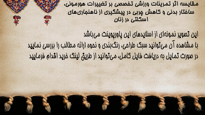 پاورپوینت مقایسه اثر تمرینات ورزشی تخصصی بر تغییرات هورمونی، ساختار بدنی و کاهش چربی در پیشگیری از ناهنجاریهای اسکلتی در زنان