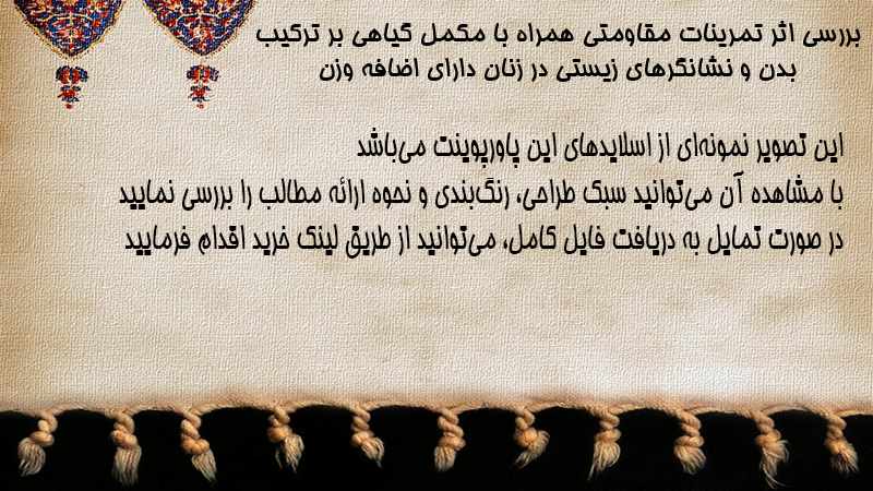 پاورپوینت بررسی اثر تمرینات مقاومتی همراه با مکمل گیاهی بر ترکیب بدن و نشانگرهای زیستی در زنان دارای اضافه وزن