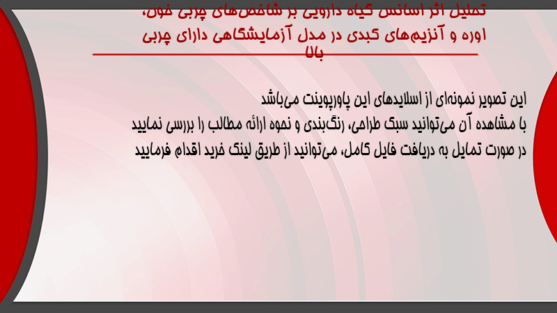 پاورپوینت تحلیل اثر اسانس گیاه دارویی بر شاخصهای چربی خون، اوره و آنزیمهای کبدی در مدل آزمایشگاهی دارای چربی بالا