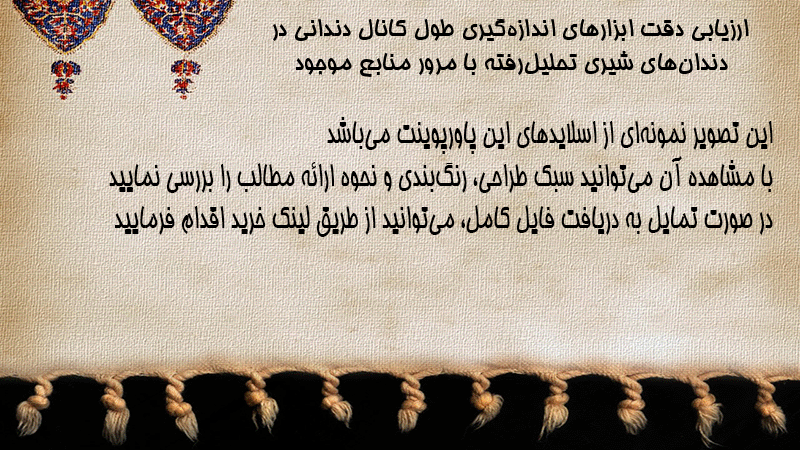 پاورپوینت ارزیابی دقت ابزارهای اندازهگیری طول کانال دندانی در دندانهای شیری تحلیلرفته با مرور منابع موجود