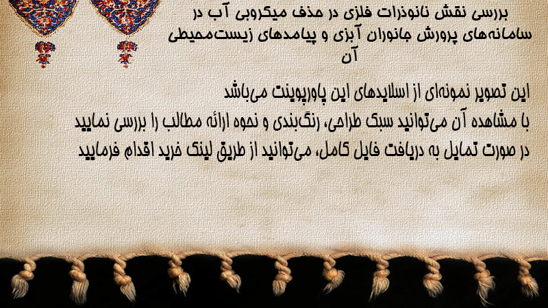 پاورپوینت بررسی نقش نانوذرات فلزی در حذف میکروبی آب در سامانههای پرورش جانوران آبزی و پیامدهای زیستمحیطی آن