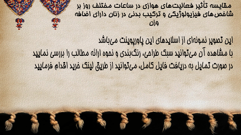پاورپوینت مقایسه تأثیر فعالیتهای هوازی در ساعات مختلف روز بر شاخصهای فیزیولوژیکی و ترکیب بدنی در زنان دارای اضافه وزن