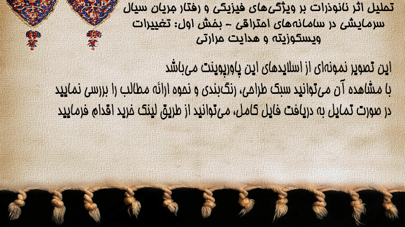 پاورپوینت تحلیل اثر نانوذرات بر ویژگیهای فیزیکی و رفتار جریان سیال سرمایشی در سامانههای احتراقی – بخش اول: تغییرات ویسکوزیته و هدایت حرارتی