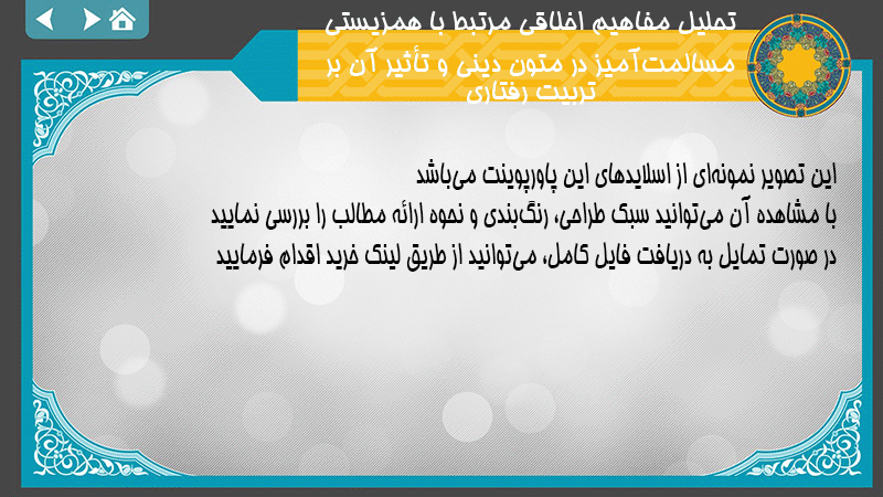 پاورپوینت تحلیل مفاهیم اخلاقی مرتبط با همزیستی مسالمتآمیز در متون دینی و تأثیر آن بر تربیت رفتاری