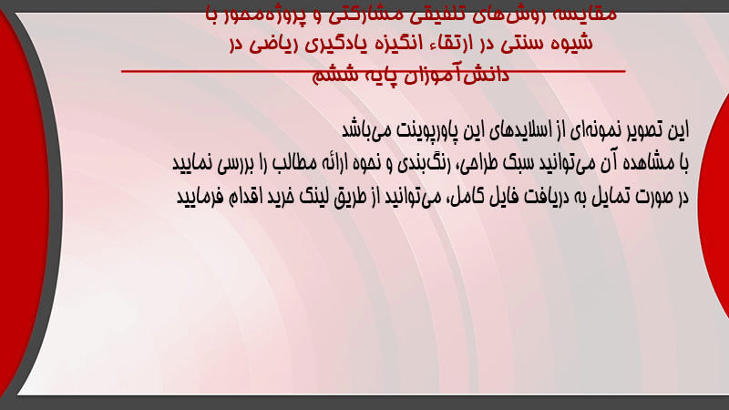 پاورپوینت مقایسه روشهای تلفیقی مشارکتی و پروژهمحور با شیوه سنتی در ارتقاء انگیزه یادگیری ریاضی در دانشآموزان پایه ششم
