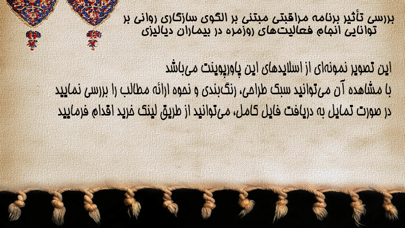 پاورپوینت بررسی تأثیر برنامه مراقبتی مبتنی بر الگوی سازگاری روانی بر توانایی انجام فعالیتهای روزمره در بیماران دیالیزی