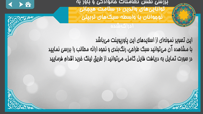 پاورپوینت بررسی نقش تعاملات خانوادگی و باور به تواناییهای والدین در سلامت هیجانی نوجوانان با واسطه سبکهای تربیتی ادراکشده